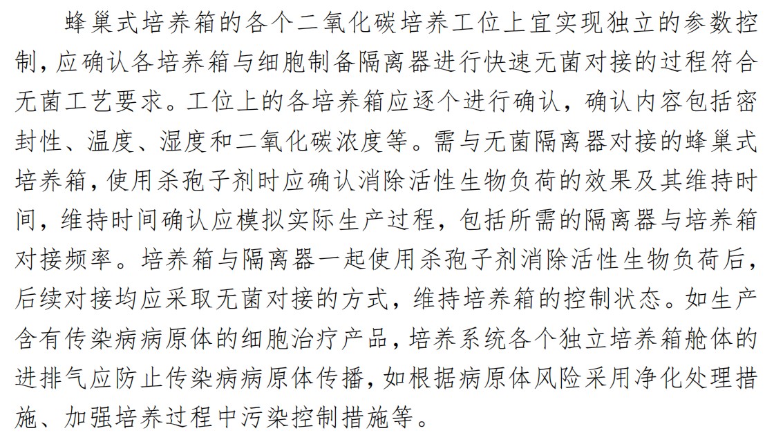 蜂巢培養(yǎng)箱是由蜂巢式多工位模塊和配套的培養(yǎng)箱組成,為細胞培養(yǎng)的常用設(shè)備,在《指南》中也有較詳細的闡述,主要包括設(shè)備構(gòu)成與內(nèi)部環(huán)境要求、設(shè)備電源要求、氣源要求、參數(shù)和性能的確認等。